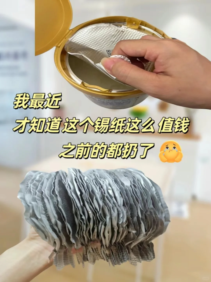 如果大家将家中小朋友喝过的所有奶粉罐上的密封铝膜纸全部积攒起来的话,用不了一段时间就能够攒“一大袋子”的密封铝膜纸。